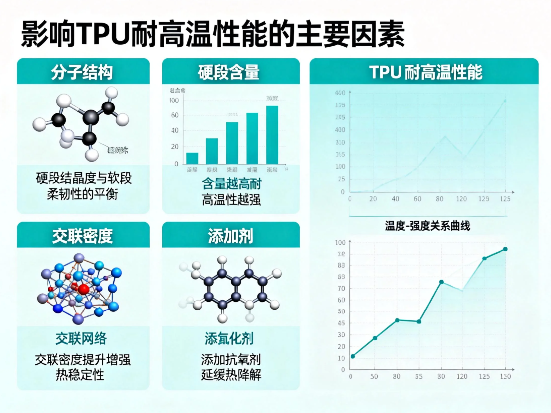 TPU(热塑性聚氨酯弹性体)的耐高温性能是其核心应用指标之一,直接决定了材料在汽车、电子、工业密封等高温工况下的使用寿命和可靠性。其耐高温能力并非单一因素决定,而是由分子结构、配方体系、加工工艺及外部环境等多方面共同作用的结果。以下是影响TPU耐高温性能的核心因素详细解析: